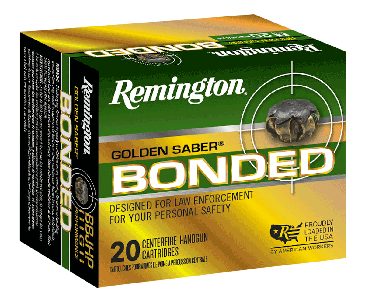 Remington Golden Saber Defense Ammunition is based on the same platform trusted by law enforcement professionals to protect the American way of life, now available for personal defense. Loaded with high performance Golden Saber Brass Jacketed Hollow Point (BJHP) bullets, these rounds deliver massive expansion and deep penetration for ultimate stopping power. Premier nickel-plated cases resist corrosion and cycle dependably after extended storage. Available in loadings maximized for full size as well as compact pistols and revolvers, as well as in the most popular calibers. This ammunition is new production, non-corrosive, in boxer-primed, reloadable nickel-plated brass cases.
